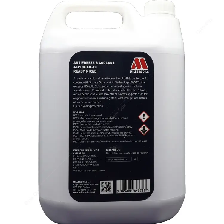 Alpine Lilac Ready Mixed is a Monoethylene Glycol (MEG) antifreeze and coolant with Organic Acid Technology (OAT) and silicate technology premixed with water at 50:50 ratio that will provide freeze protection down to -40 °C. Alpine Lilac Ready Mixed exceeds most of the European and International quality standards. Suitable for use in petrol and diesel engines (including Hybrids), and will provide all year round protection. This product does not contain nitrates, amines, phosphates and borates (NAP free).