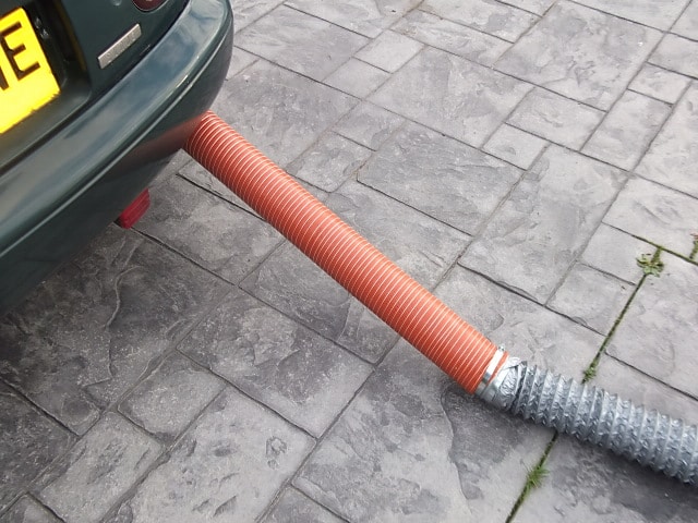 Be safe from asphyxiation, when working on your car with the engine running. Fix heatproof flexible pipe from exhaust pipe to window, garage door or outside wall.