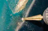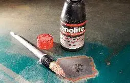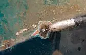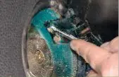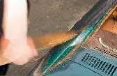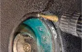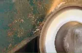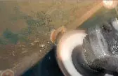 11. With a soft pad in the angle grinder, we carefully sanded the tops off, which released the actual fitting, then ground the steel rivet beneath, flush with the body.