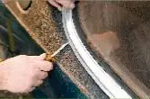 14. We’re ahead of ourselves — before we can rip the vinyl off completely we’ve still got more areas to release, like the gutters. We did these with a knife, resisting the temptation to take those stainless mouldings off. Be warned, don’t — there’s a knack and if you don’t do it properly, they will not go back on without kinks.