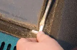 6. We then eased the old vinyl covering away from it being glued into the rebate — note that it appears to have been stuck to the roof first with double-sided tape before being stretched and tacked in place.