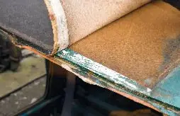 Next, move to the top and here you’re again looking for that offending sunroof, but also the general condition of the roof. Moisture can get trapped under the fabric, which often shows up as hard lumps. This is usually rust, bubbling up under the surface. If you’re unlucky, it’ll have holed the roof, which will need careful repair. However, we’ve seen vinyl covering a roof with the appearance of black sand dunes before — that one needed the whole roof replacing! And on the subject of whole roofs, that’s another perfect vinyl cover up — a roof swap. Crash damage, especially of the rolledthe- car variety often resulted in a vinyl roof being fitted. If you’ve had to replace the whole roof section from a scrap car they’re an easy way of hiding it — especially when it’s a brown roof on a white car.